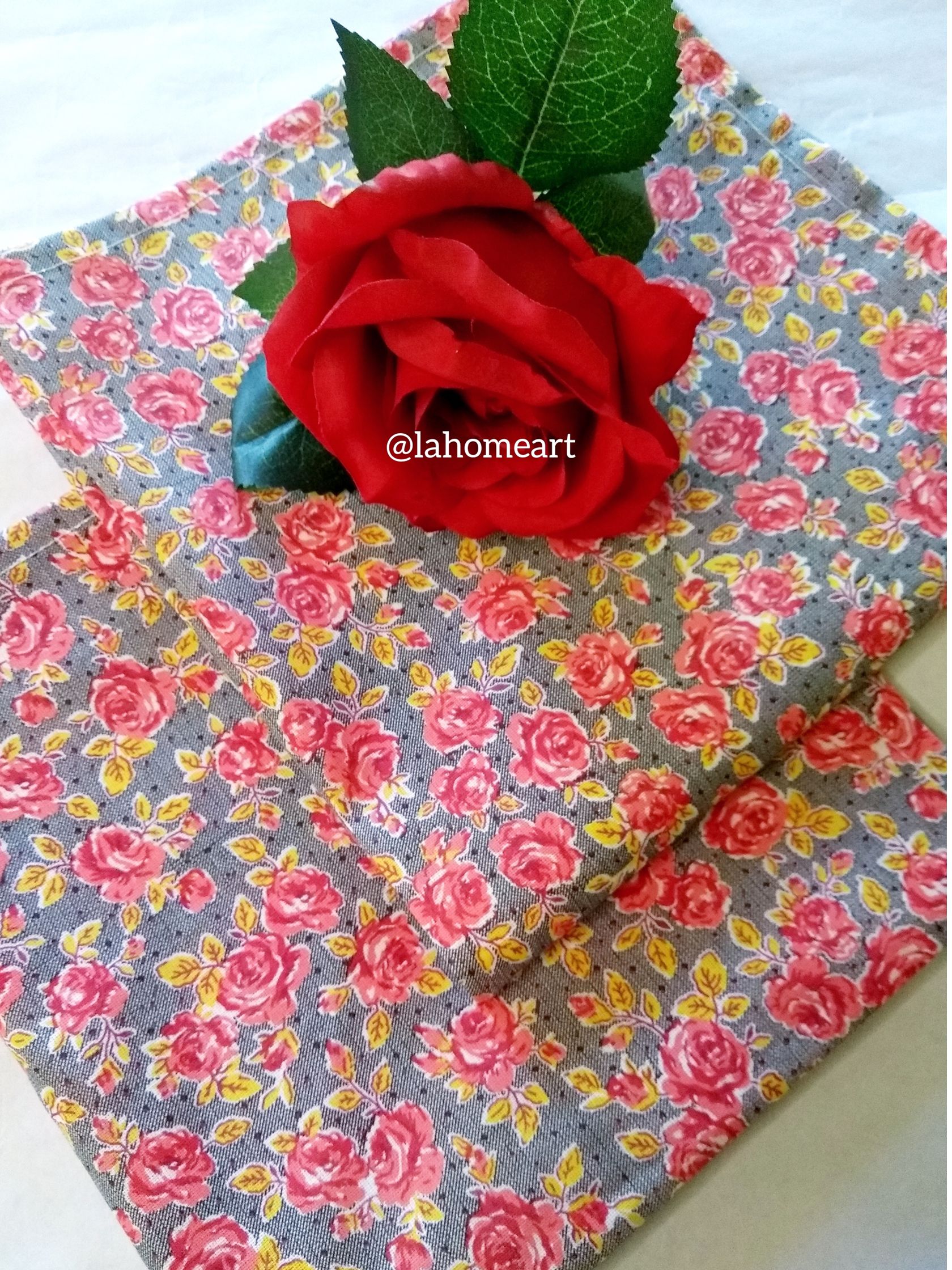 Guardanapo de mesa em tecido tricoline, 100% algodão, estampa Rosa vermelha com fundo Cinza