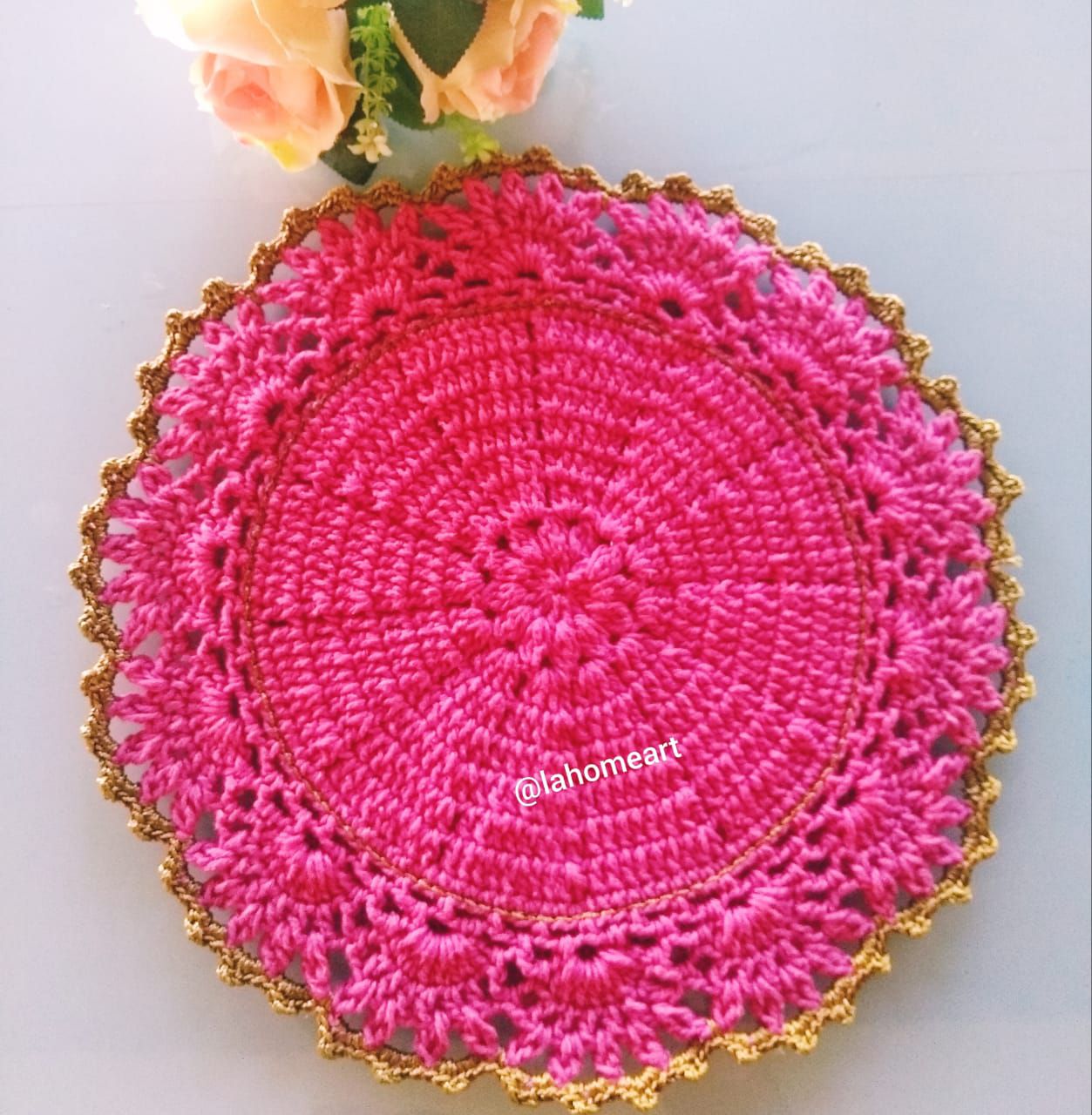Sousplat de crochê com fio 85% algodão com linha de polipropileno dourado.